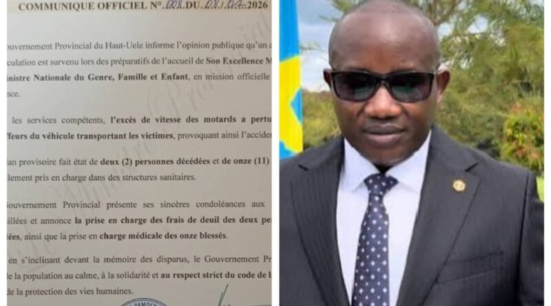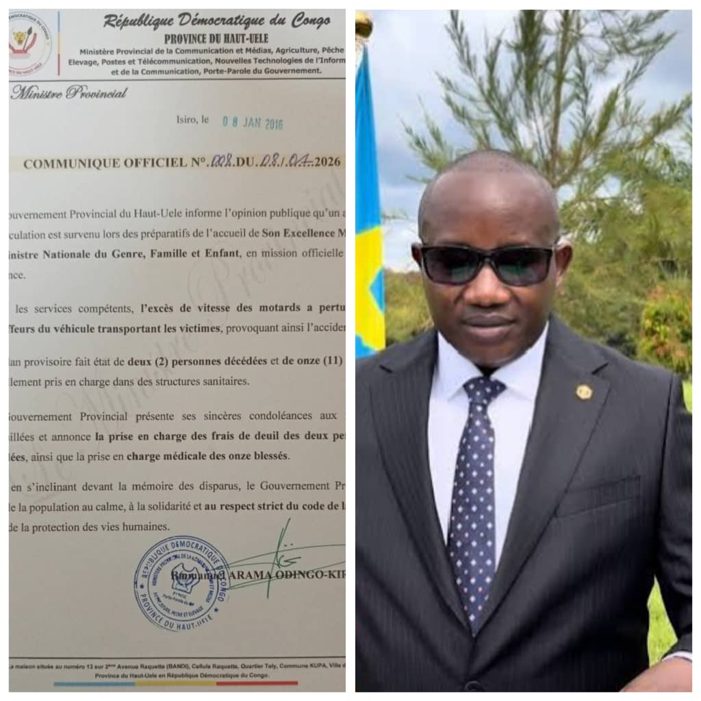 Dans un communiqué officiel n°008/2026 publié ce jeudi, le gouvernement provincial du Haut-Uele, à travers le ministère provincial de la communication et médias, informe l’opinion publique qu’un accident de circulation s’est produit ce 8 janvier 2026, lors des préparatifs liés à l’accueil de madame la Ministre nationale du genre, famille et enfant, en mission officielle dans la province.