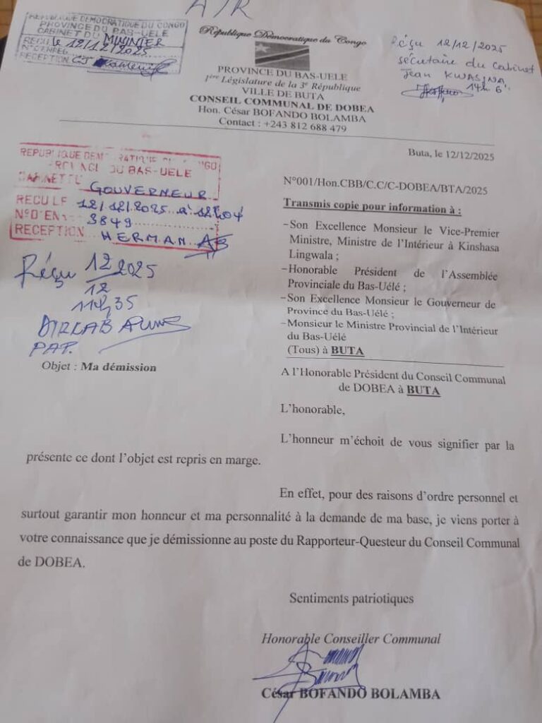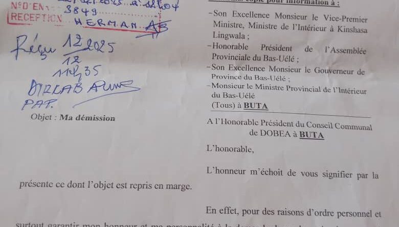 Le conseiller communal César Bofando Bolamba a officiellement déposé sa démission de ses fonctions de rapporteur-questeur du conseil communal de Dobea, dans la ville de Buta (province du Bas-Uélé), vendredi 12 décembre 2025. Dans sa correspondance, il évoque des raisons personnelles et la volonté de préserver son honneur ainsi que sa personnalité, conformément à la demande de sa base.