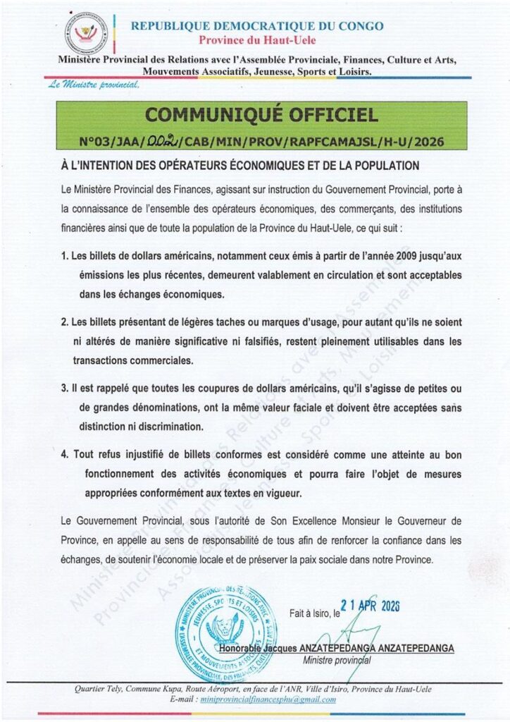 Le Gouvernement provincial du Haut-Uele attire l’attention des opérateurs économiques et de la population sur la persistance du refus injustifié de billets de banque dans les transactions commerciales, une pratique qui perturbe les échanges et pénalise les citoyens.