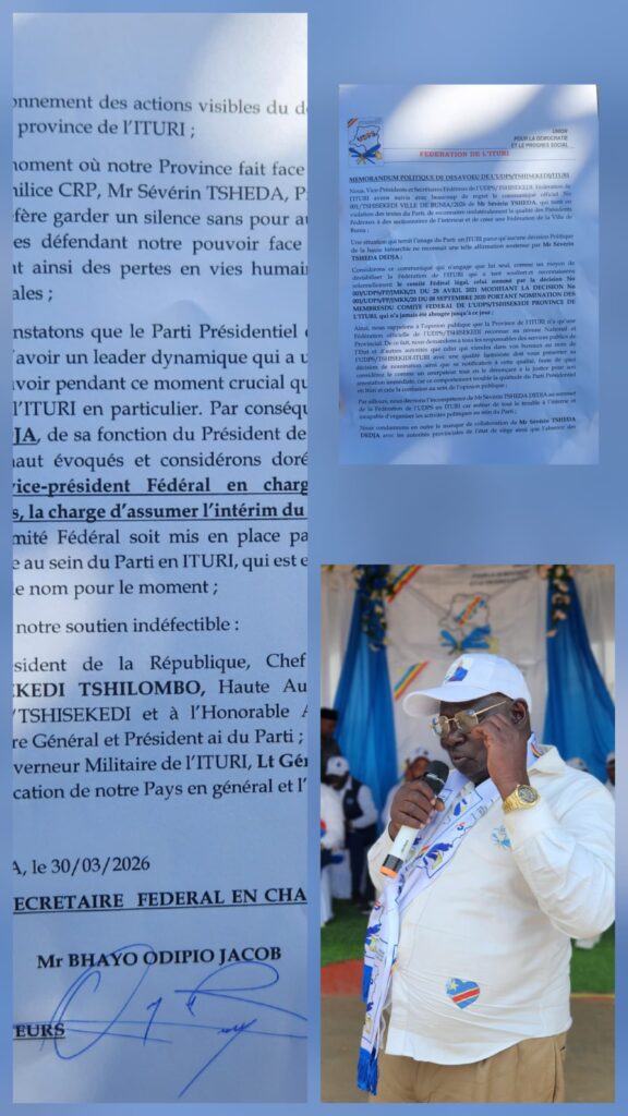 Rendu public à Bunia le 30 mars 2026, ce document révèle une crise interne susceptible d’affaiblir davantage l’implantation du parti présidentiel dans cette région sensible de la République démocratique du Congo.